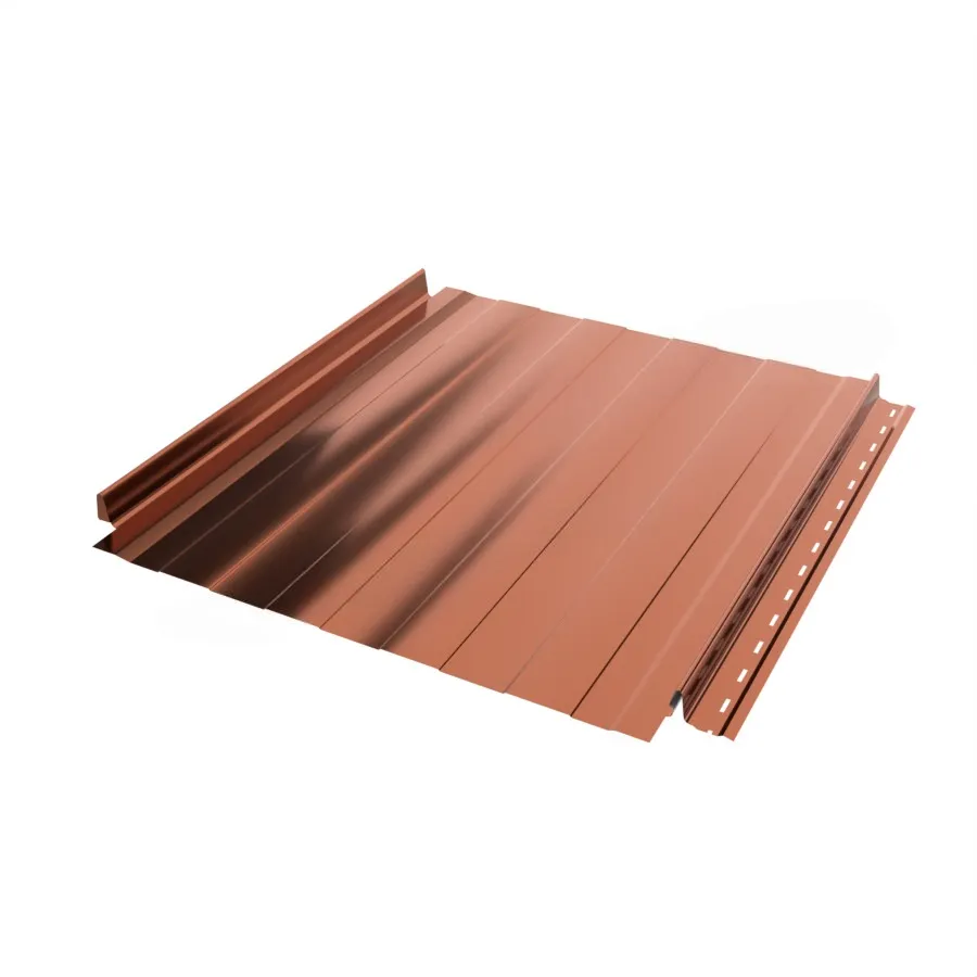 Фальцевая панель Металл Профиль FASTCLICK-T Purman представляет собой металлический материал с оформленными особым образом краями. Они служат в качестве замков, с помощью которых панели соединяют друг с другом. Стальная основа материала защищена цинковым слоем и полимерным покрытием. В связи с этим кровля из фальцевых панелей устойчива к непогоде и надолго сохраняет первоначальный внешний вид.