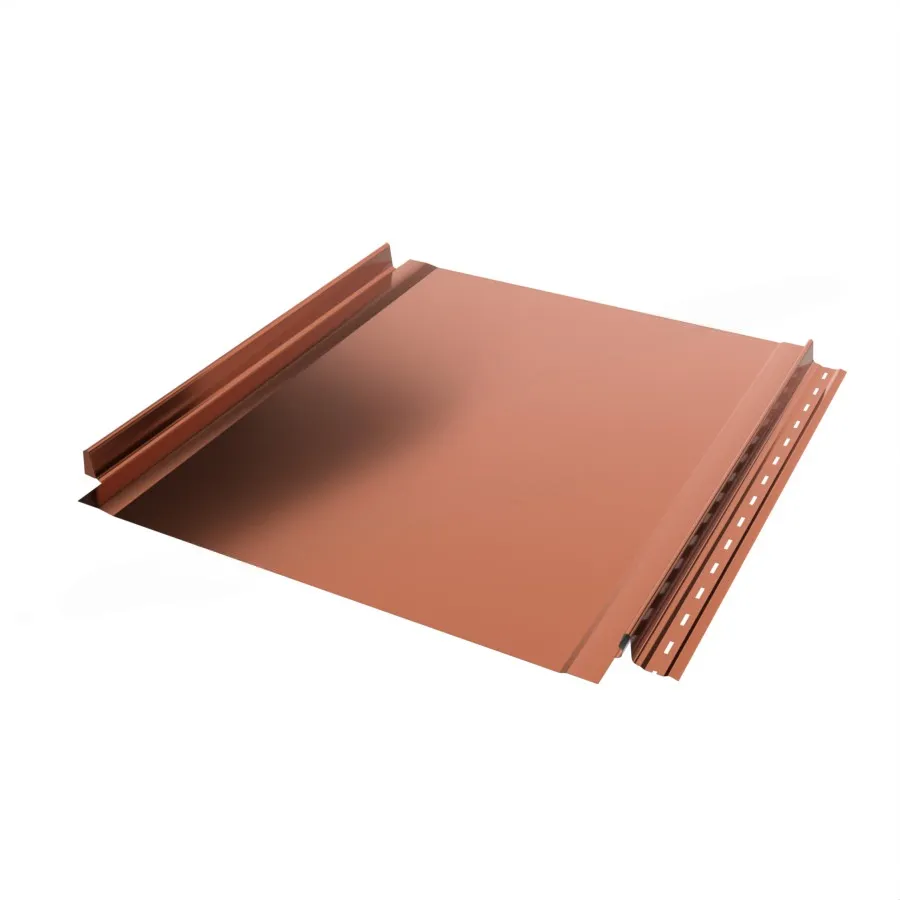 Фальцевая панель Металл Профиль FASTCLICK Purman представляет собой металлический материал с оформленными особым образом краями. Они служат в качестве замков, с помощью которых панели соединяют друг с другом. Стальная основа материала защищена цинковым слоем и полимерным покрытием. В связи с этим кровля из фальцевых панелей устойчива к непогоде и надолго сохраняет первоначальный внешний вид.