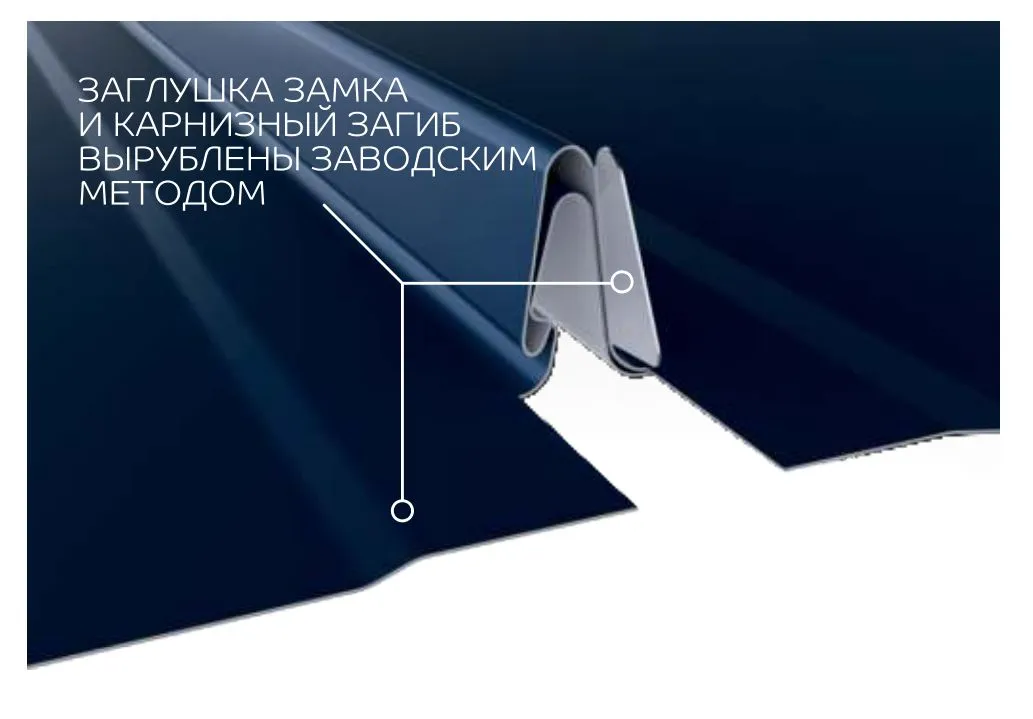 Заглушка замка и карнизный загиб фальцевых панелей от «Металл Профиль» вырублены заводским методом. Это значительно облегчит и ускорит их установку: не потребуется самостоятельно резать материал. Кроме того, чтобы соединить панели, не потребуется специальное оборудование — удобные замки защёлкиваются одним нажатием.