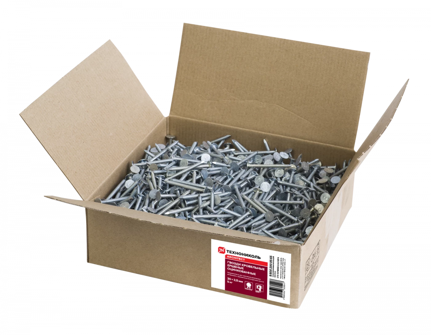 Ершёные гвозди 3,5×30 мм — специальный крепёж для гибкой черепицы с насечками на стержне, которые не дают гвоздю выйти обратно под действием ветра.